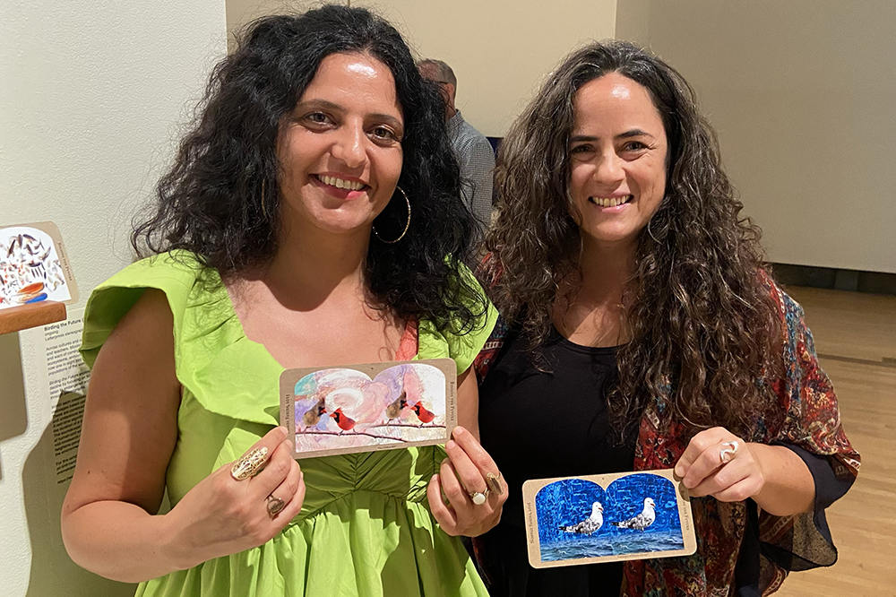 Krista Caballero (right), co-lead of the Experimental Humanities Collaborative Network (EHCN) and co-curator of "To Be–Named," and Vivien Sansour, Distinguished Artistic Fellow at EHCN, pose in front of Caballero and Frank Ekeberg's "Birding the Future" at the exhibit's recent opening in Albany. Photo by Terry Roethlein.